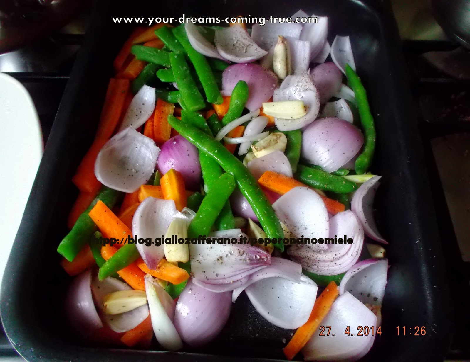 - Set your four legged grate in the pan over the veggies.